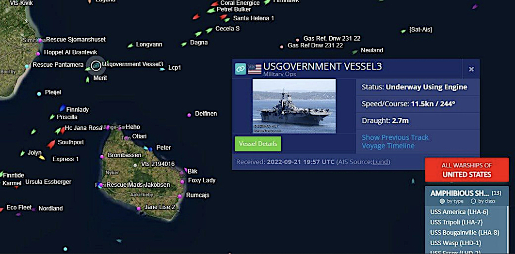 Hangarskipet USS «Kearsage» forlot Polen mandag 19. september og gikk mot Bornholm et par dager senere, omgitt av eskortefartøyene. Det ville være meget underlig om de ikke fikk inn en seilbåt av typen «Andromeda» og praiet den, spesielt med helikoptre på konstante patruljer. Foto: US Navy.