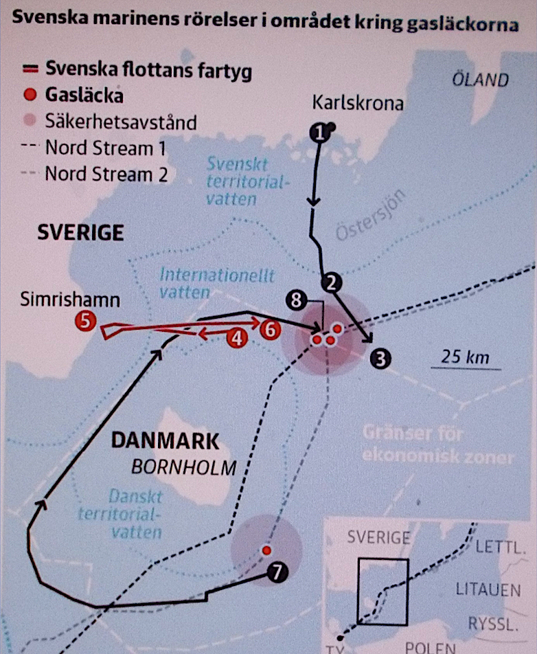 En advarsel av ukjent opprinnelse fikk den svenske flåten til å gå til sjøs fra Karlskrona (1) torsdag 22. september 2022. En flotilje på to til fire fartøyer satte full fart mot det første eksplosjonsstedet, som ble nådd kl. 13.03, men da ble kjenningssystemet AIS slått av (2 og 3). På samme tidspunkt må «Andromeda» ha vært i fullt arbeid på eksplosjonssted nr. 3 (rødt punkt ved sort tall 7).
