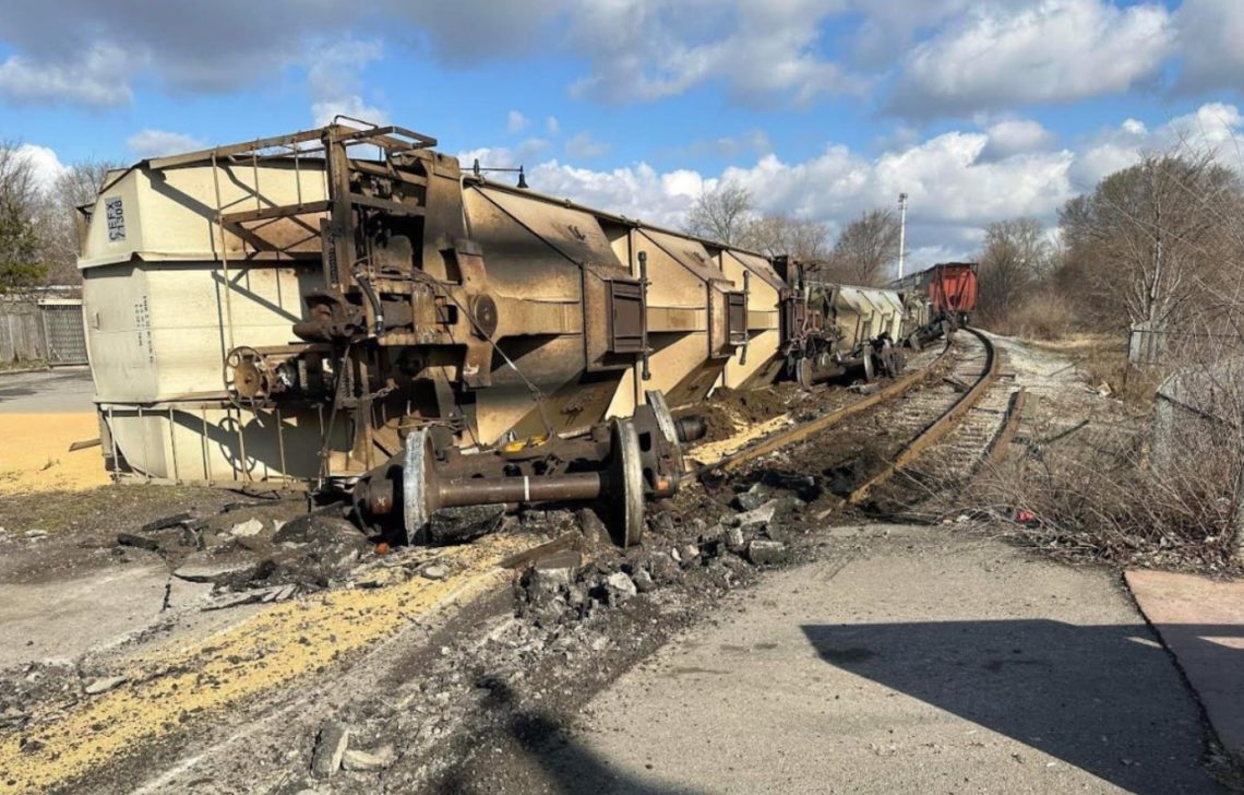 Et godstog som fraktet hvete sporet av i Canada lørdag. Matlasten ble spredt utover en parkeringsplass, og er tapt.