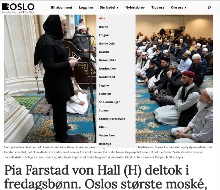 De viste sympati med ofrene, deres pårørende – og deres trosfeller i Oslo, skrev NTB den gangen, og som praksisen tilsier, er det i moskéen et eget bønnerom for kvinner, får vi vite i en bisetning. Medlem av Høyres kvinneforum, von Hall, deltok imidlertid i hovedrommet, som er forbeholdt menn.