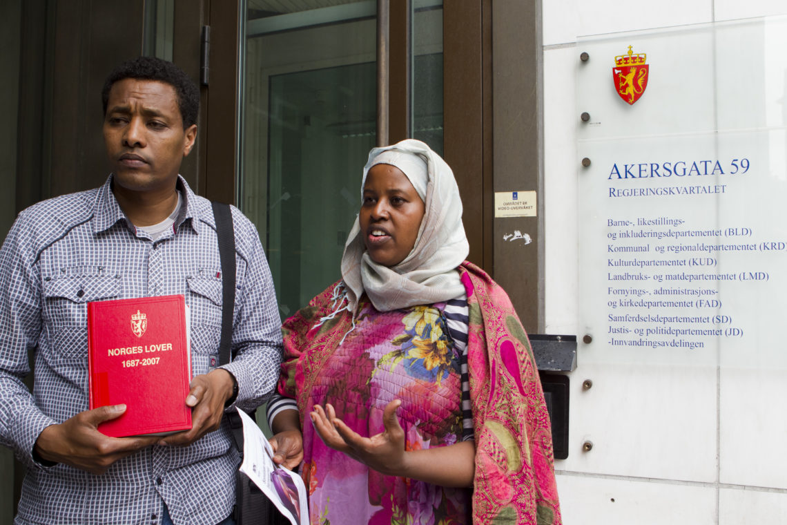 Oslo 20110608. F.v. Hassan Ali Omar (styreleder , InterSom) og Maima Abdiraman (Somalisk familievennforening) etter at de overrakte et skriv til barne-, likestillings- og inkluderingsminister Audun Lysbakken om somaliernes møte med norsk barnevern utenfor regjeringskvartalet i Akersgata 59. Hassan Ali Omar holder Norges Lover Foto: Berit Roald / NTB