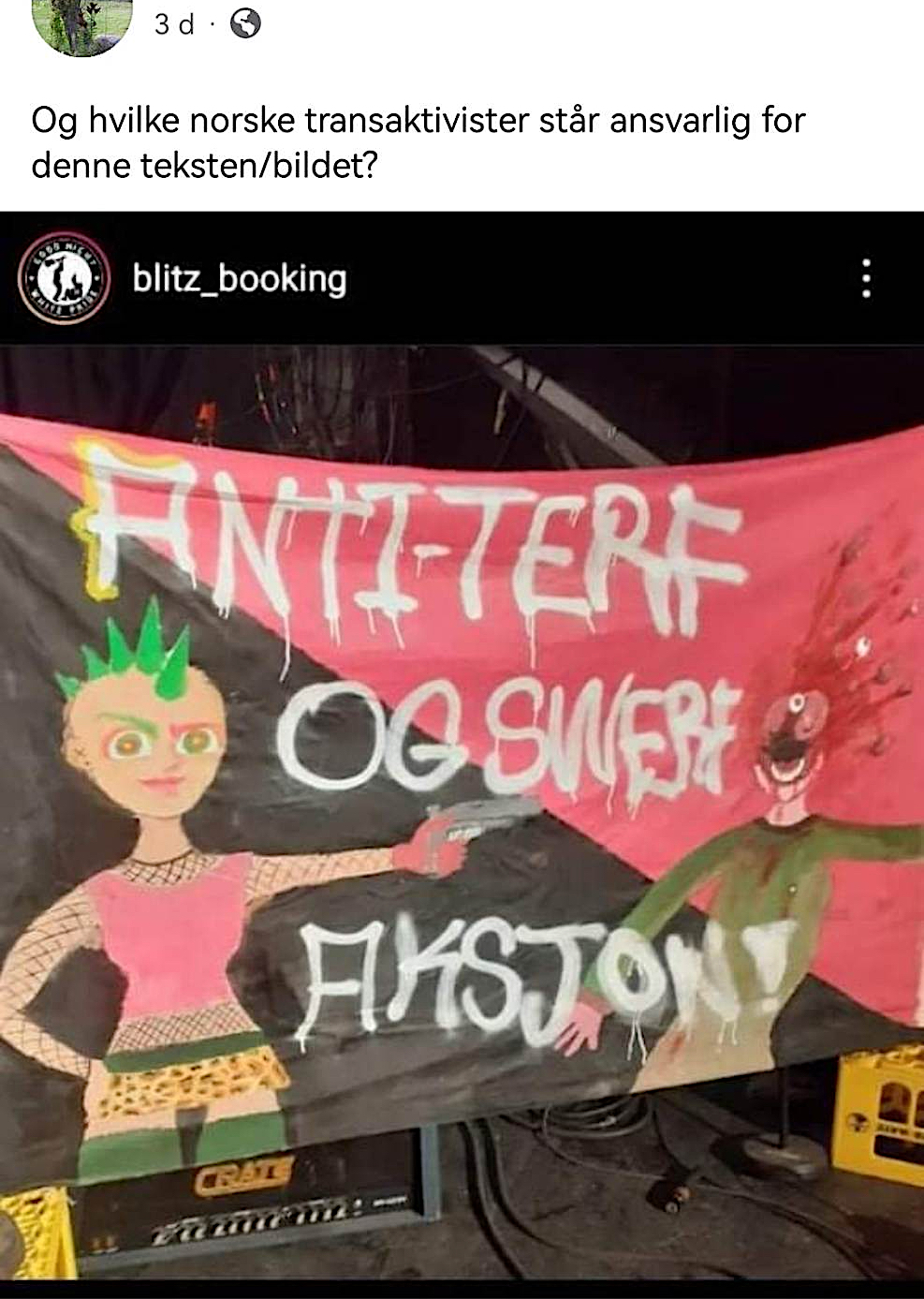 Når de ikke går fysisk til verks, bruker transaktivister voldelige ord og uttrykk for å forsøke å skremme kritikere til taushet. Dette skjer også i hjemlige trakter. Blitz hadde en plakat som viste en transaktivist som skjøt mot en «terf» (en trans-exclusionary radical feminist).