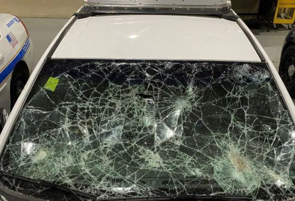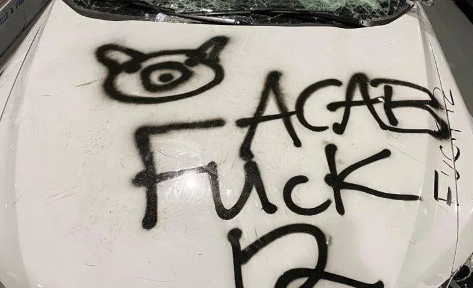 Etter at Jones og Harris gikk ned fra den merkede politibilen, klatret andre demonstranter på taket og begynte å sparke inn vinduer og utførte annet hærverk på bilen.
