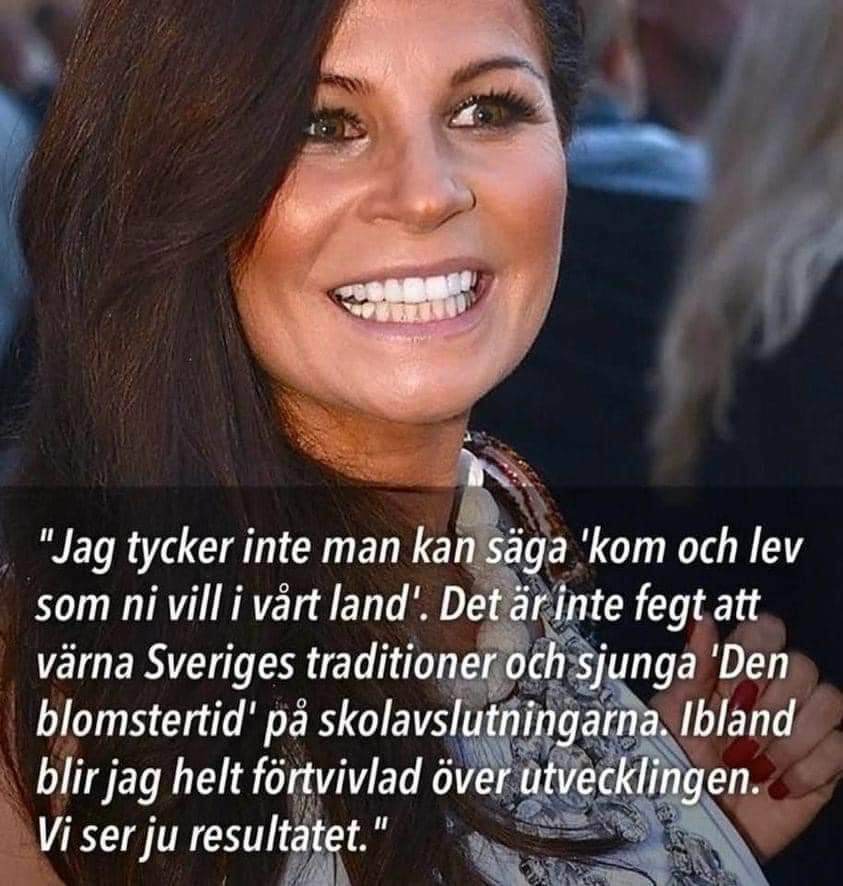 – Jag tycker inte man kan säga: Kom och lev som ni vill i vårt land. Det är inte fegt att värna Sveriges traditioner och sjunga «Den blomstertid» på skolavslutningarna. Ibland blir jag helt förtvivlad över utvecklingen. Vi ser ju resultatet, sa Carola Häggkvist. Når hun så blir spurt om hvilke resultater hun sikter til, svarer hun: