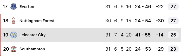 Tabellen ser mørk ut for et fryktelig svakt Leicester, som virker å ha mistet troen. De fikk seg et trøstemål i det 74. minutt, men det hjelper ikke så mye.