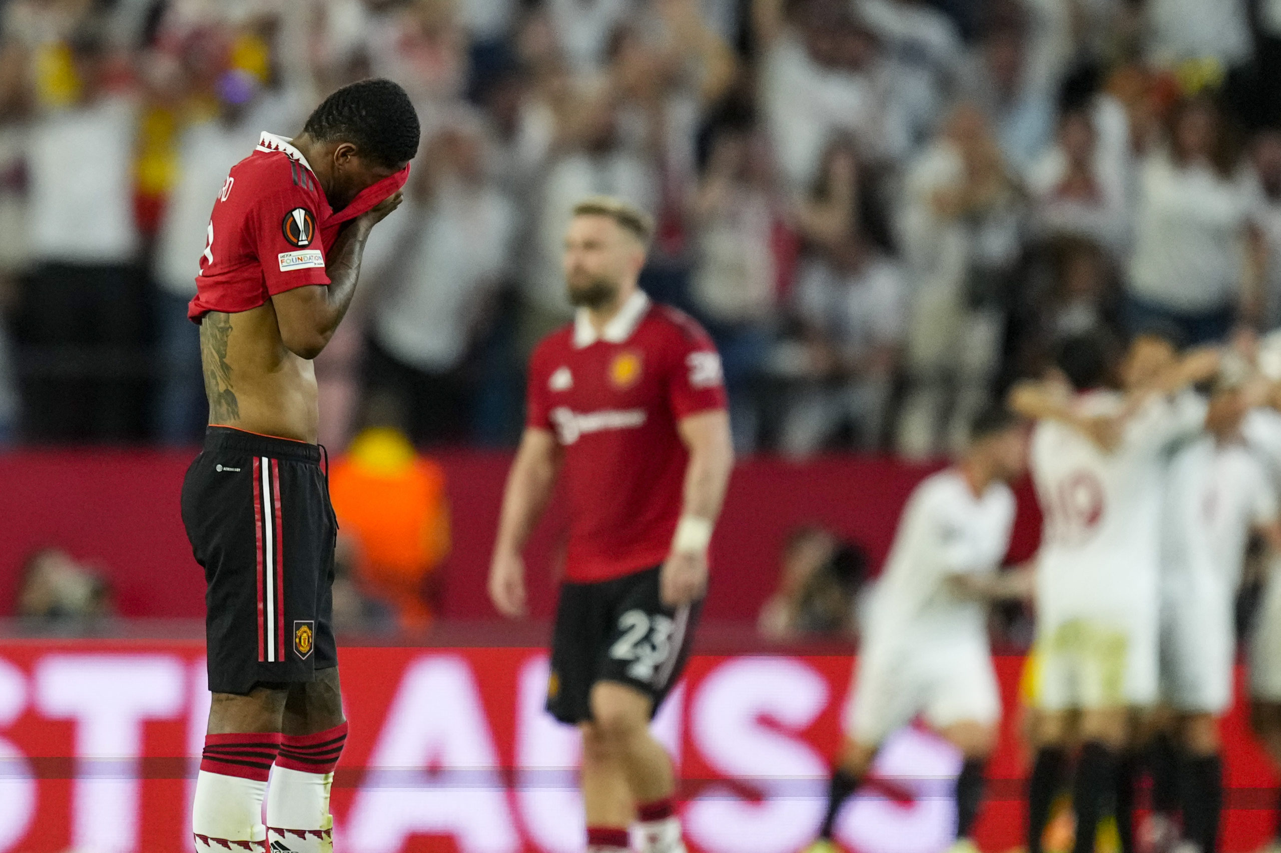 Marcus Rashford fortviler mens Sevilla-spillerne i bakgrunnen feirer sin tredje scoring mot Manchester United i torsdagens returkamp i europaligaen. Foto: Jose Breton, AP / NTB