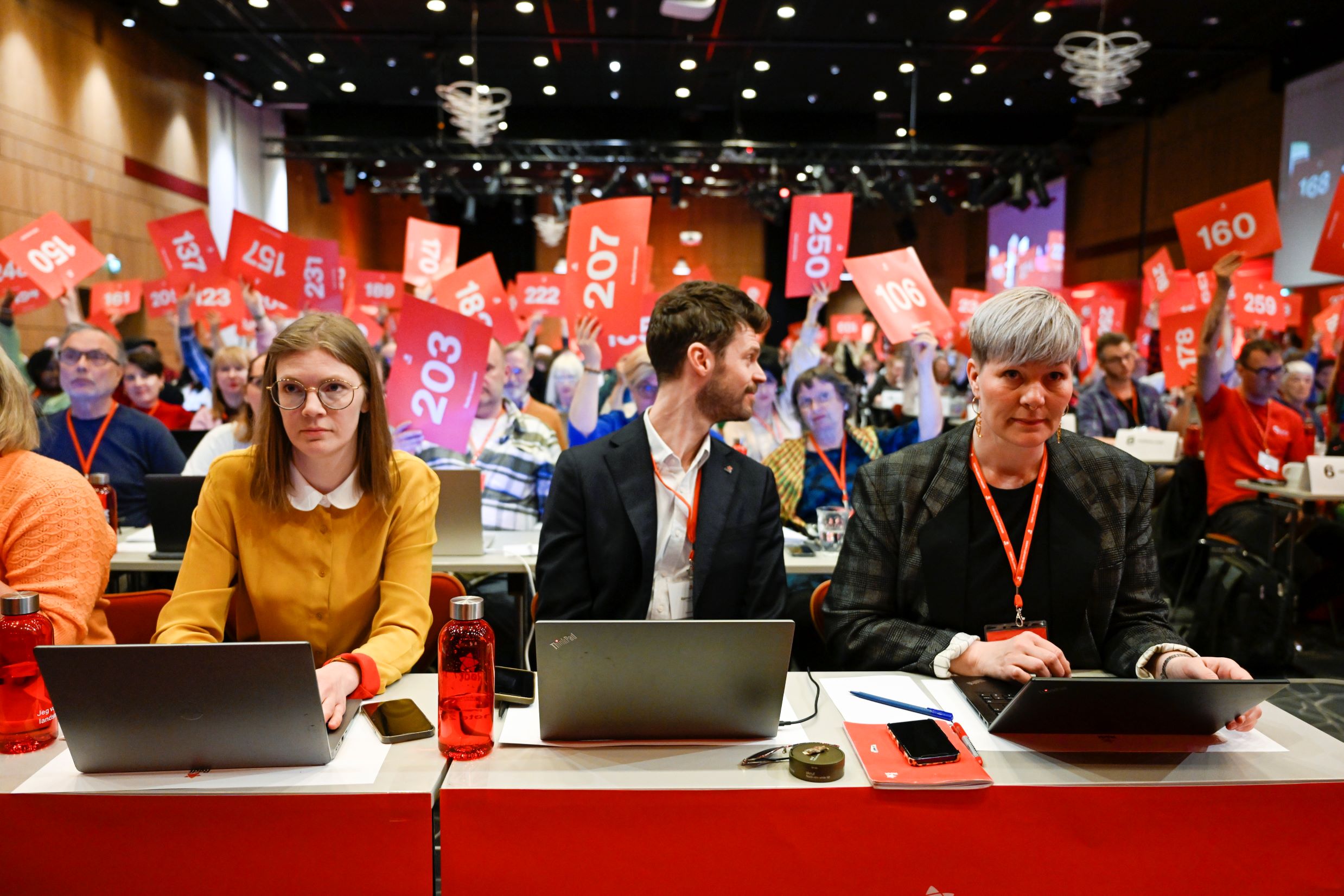 Marie Sneve Martiniussen t.v., Bjørnar Moxnes og. Benedikte Pryneid Hansen t.h. på Rødts landsmøte i Stavanger. Foto: Carina Johansen / NTB
