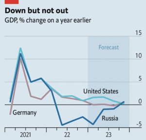 Forsøket på å svekke Russlands økonomi så mye at landet taper Ukraina-krigen, er mislykket, men sanksjonene svekker Russland tilstrekkelig teknologisk til at de heller ikke kan vinne, analyserer The Economist. Kina kan endre balansen i Russlands favør, men Beijing spiller sine kort med omhu.