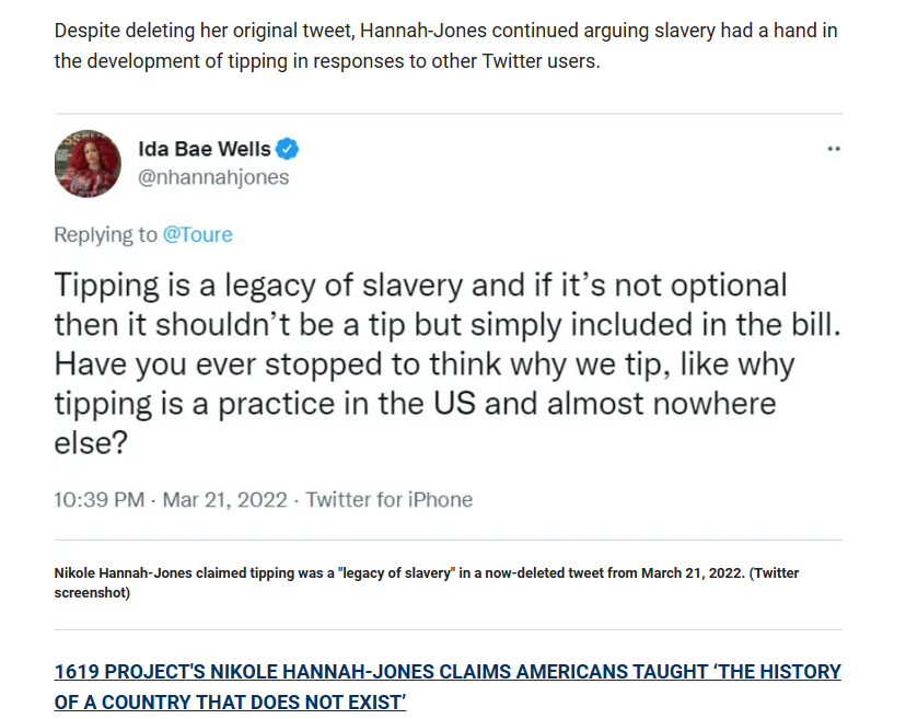 At tips er en arv fra slavetiden er den siste påstanden fra Nikole Hannah-Jones, skaperen av New York Times sitt 1619-prosjekt, skriver Magness. I en tweet skrev hun at tipping is legacy of the slavery, akkurat samme ordene Bjørgaas bruker: en arv etter slaveriet. Hanna-Jones spør hvorfor tips er en praksis i USA og nesten ingen andre steder.