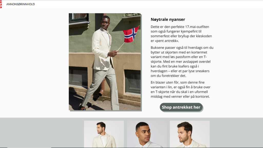VG hadde plassert annonsen fra Boys of Europe, som er en norsk kles-kjede, midt innimellom de siste nyhetene om Trump-rettssaken og Republikanere som heller vil se verden brenne enn å bli enige om gjeldstaket. Det var umulig å ikke se reklamen og umulig ikke å reagere.