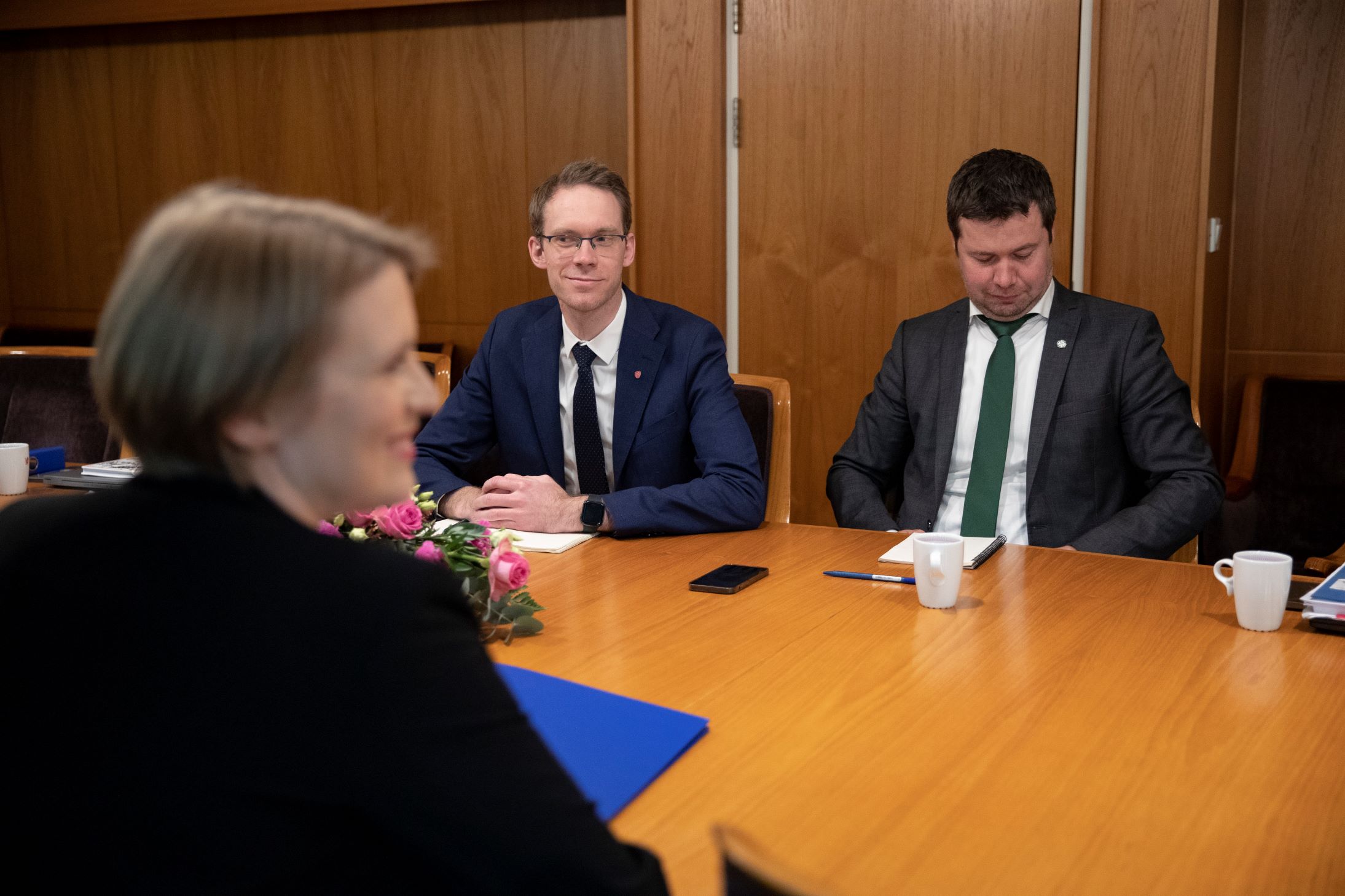 Kari Elisabeth Kaski (SV), Eigil Knutsen (Ap) og Geir Pollestad (Sp) forhandler om revidert nasjonalbudsjett. Foto: Hanna Johre / NTB