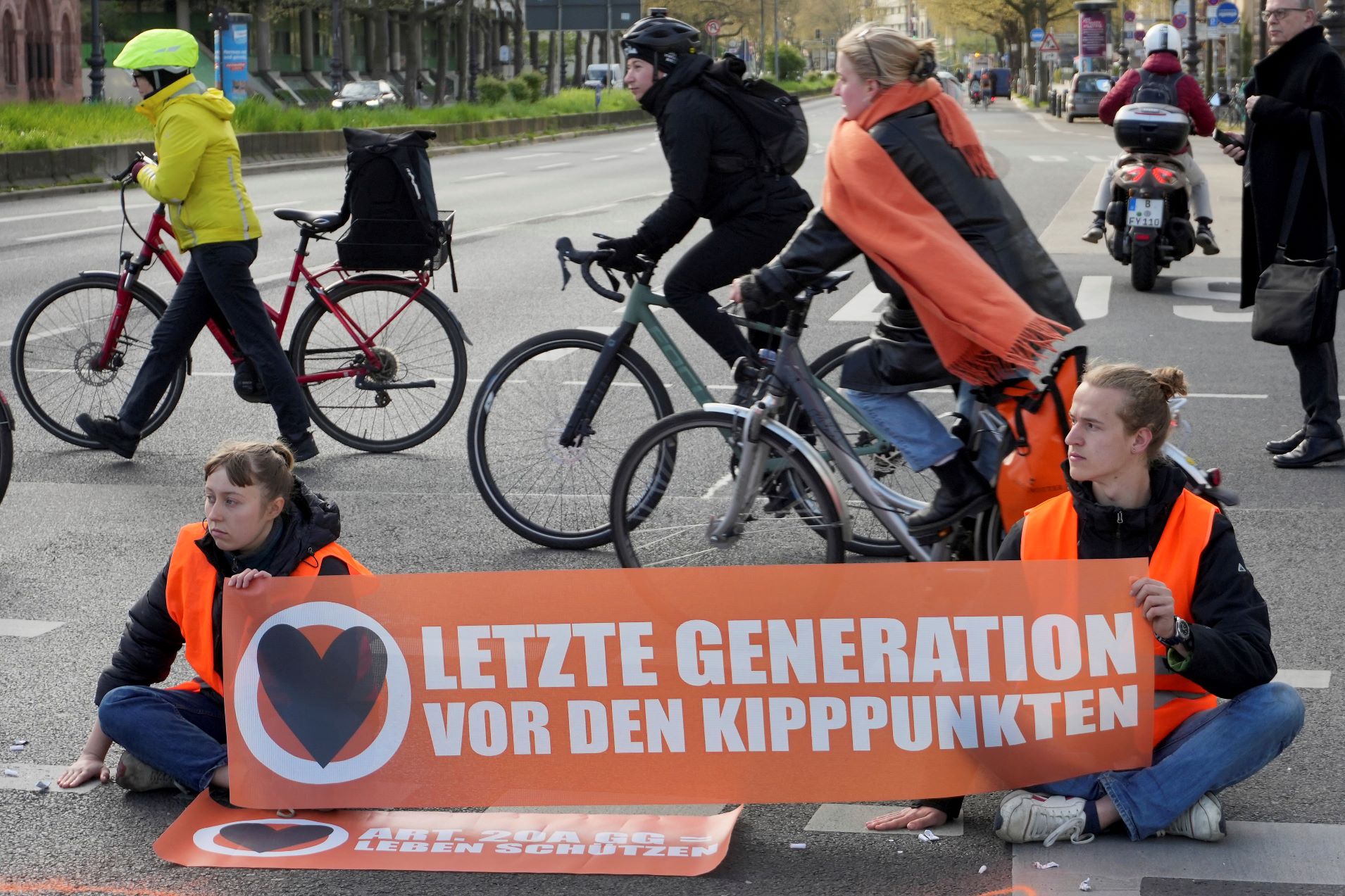 Ekstremistgruppen Letzte Generation aksjonerer i Berlin. Foto: (AP Photo/Michael Sohn