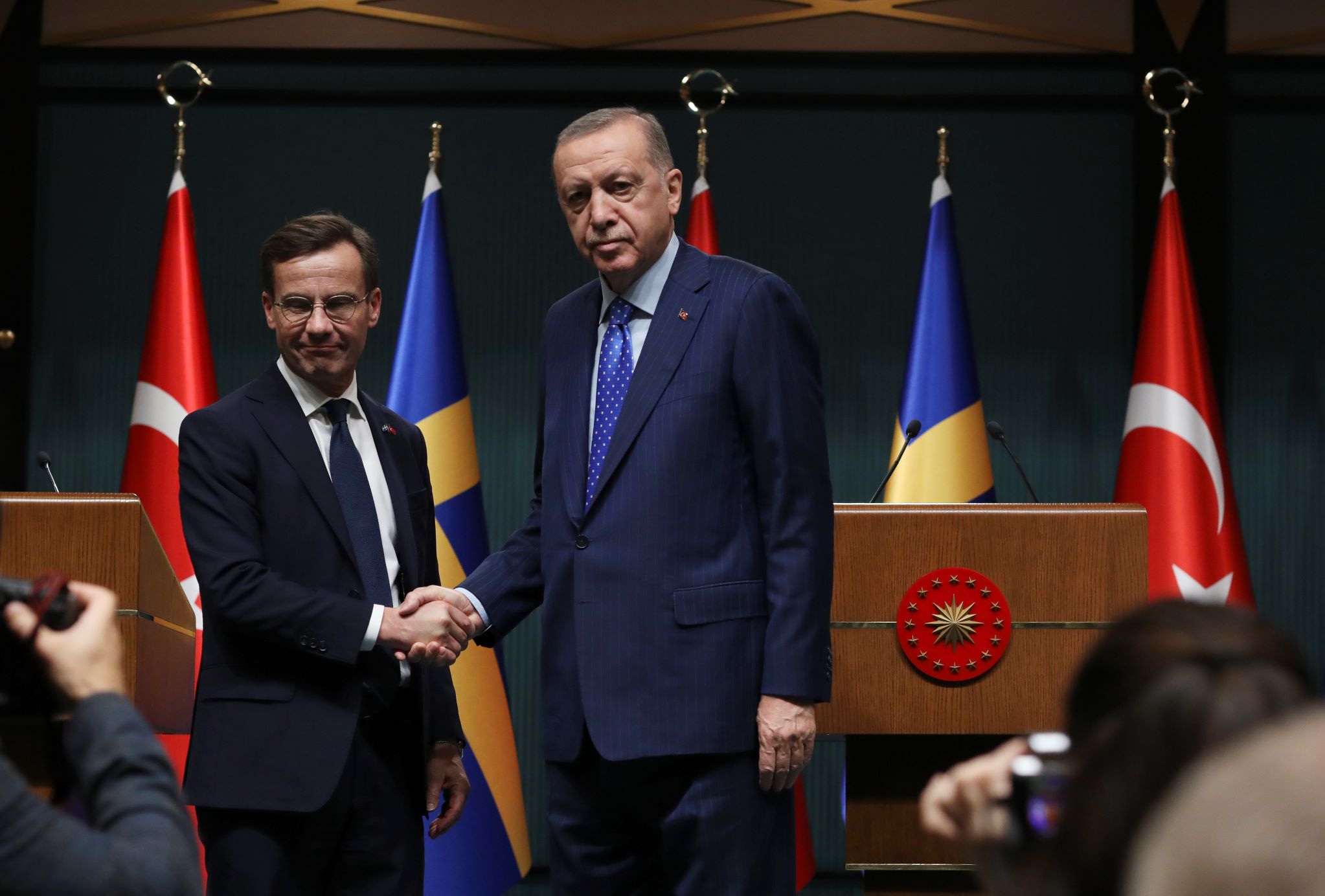 Sveriges statsminister Ulf Kristersson og Tyrkias president Recep Tayyip Erdogan. Foto: AP Photo/Burhan Ozbilici