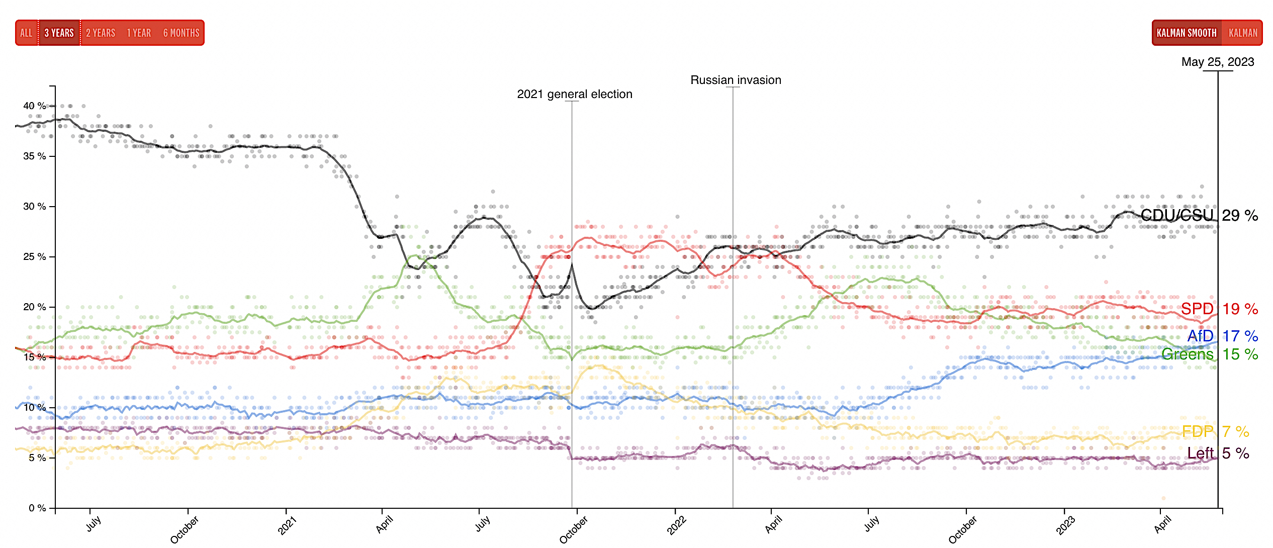 Målingen befester en oppadgående trend for AfD og en nedadgående for De grønne som har vart i et års tid, og det er første gang siden 2018 at AfD er størst av de to.