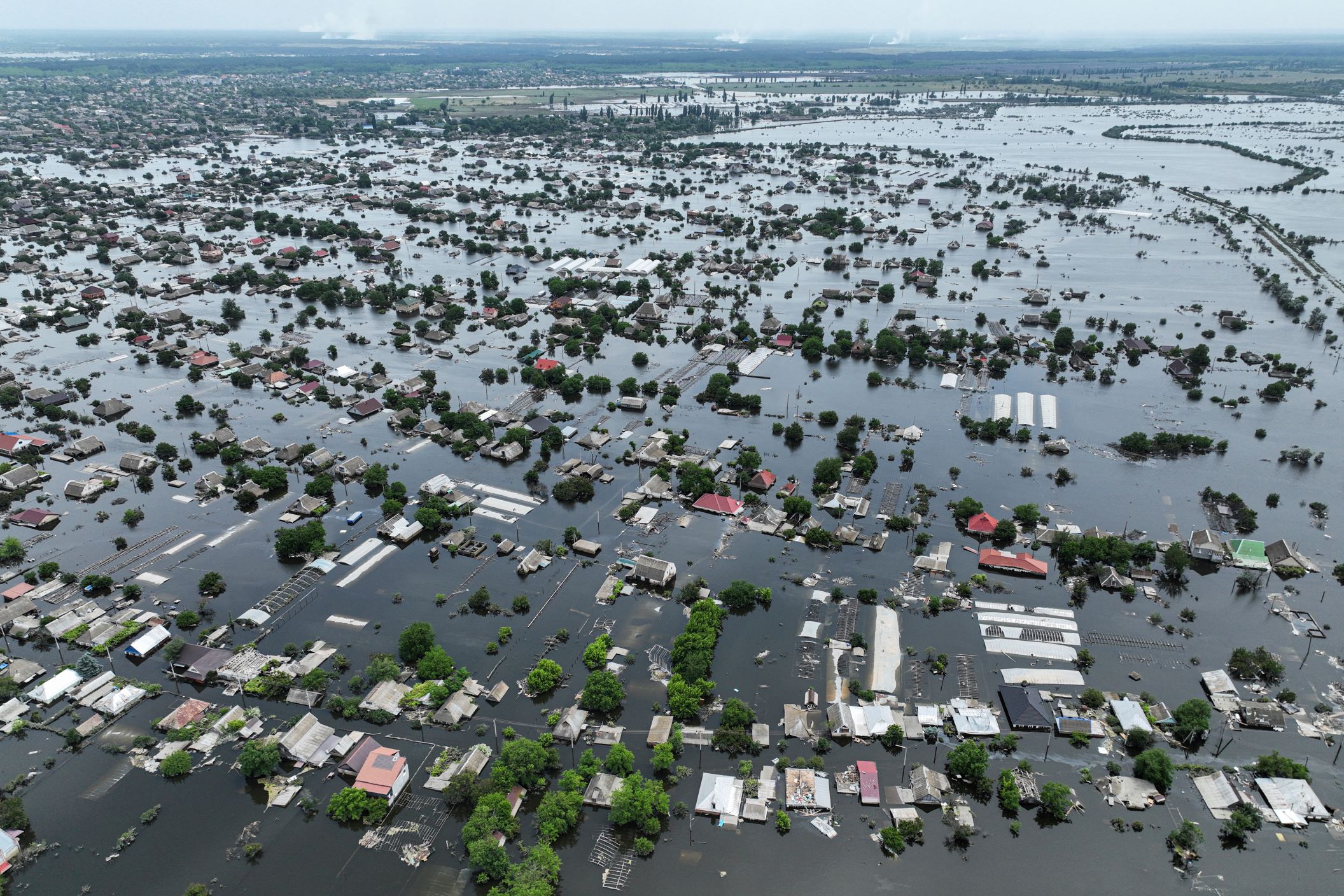 Ukrainas innenriksdepartement forsøker å skaffe seg oversikt over skadeomfanget, og opplyser at 32 byer og landsbyer med til sammen 3784 hus fortsatt står under vann på den ukrainske høyrebredden av elven Dnipro.
