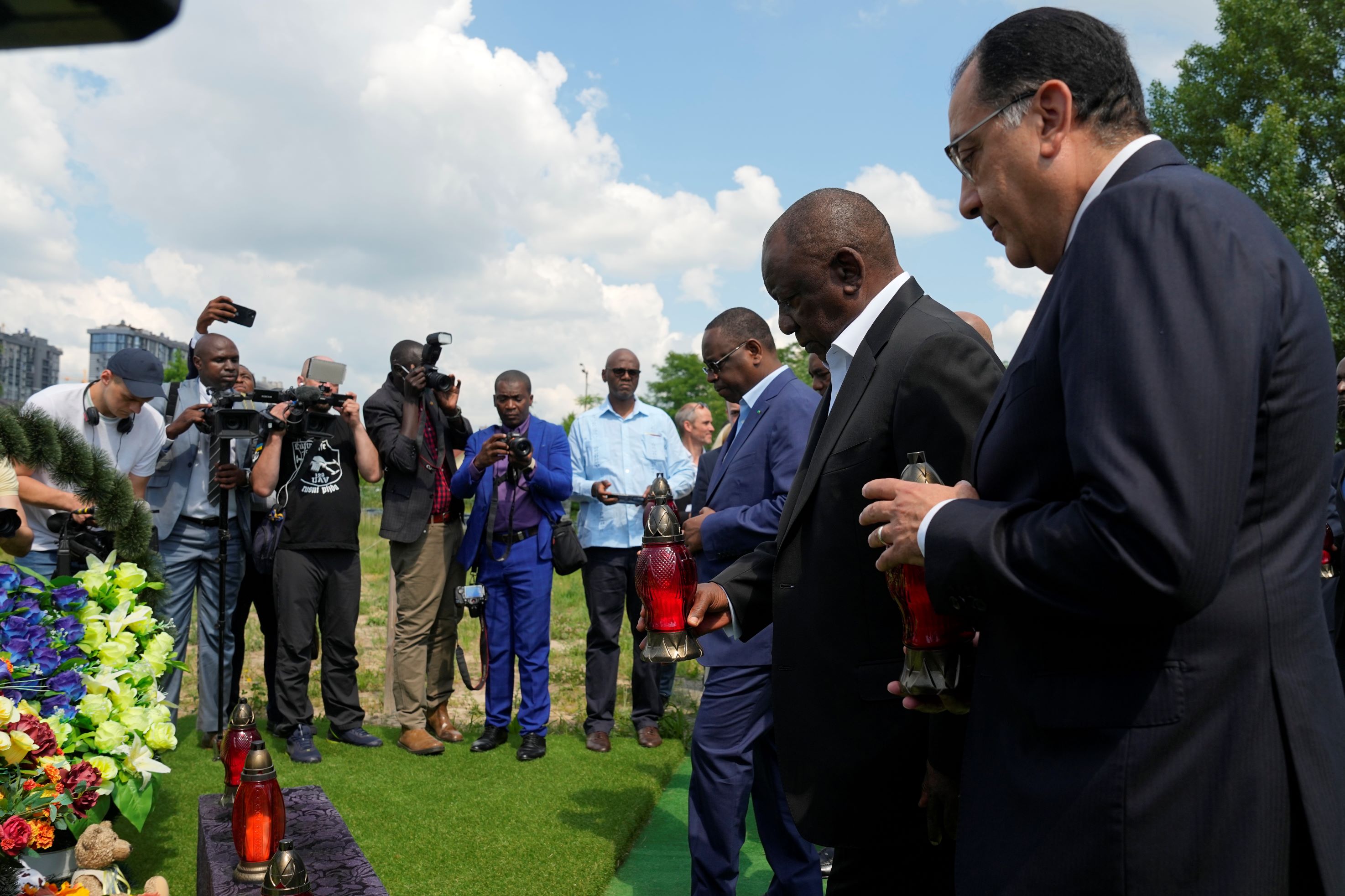 Sør-Afrikas president Cyril Ramaphosa (nr. to fra h.) Senegals president Macky Sall (ventre) og Egypts statsminister ter Mustafa Madbuly (h.) besøker et gravsted for ofre for den russiske krigføringen i Butsja utenfor Kyiv, fredag 16. juni 2023. Foto: AP Photo/Efrem Lukatsky