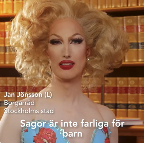 Jan Jönsson, 45 år gammel og medlem av det borgerlige partiet Liberalerna, gjør dette som et svar på Sverigedemokraternas gjentatte kritikk av at dragqueens holder eventyrstunder for barn på bibliotekene og omvisninger på Dramaten.