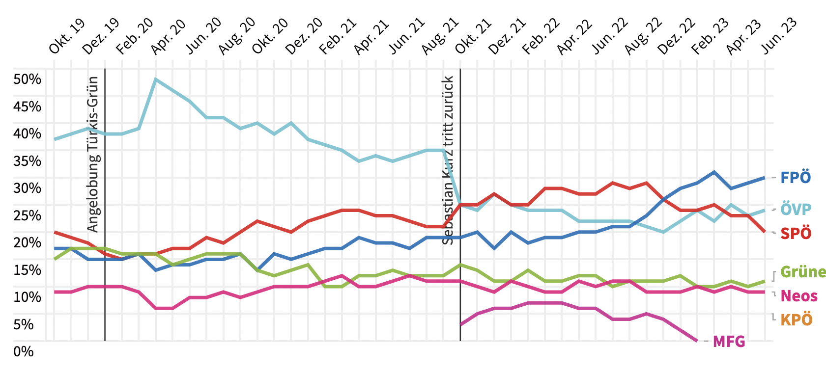 De grønne er fjerde størst med 11 prosent. Det betyr at de to partiene som i øyeblikket utgjør regjeringskoalisjonen i Østerrike, ÖVP og De grønne, ikke har mer enn 35 prosents oppslutning til sammen. Hvis det var valg nå, ville utsiktene være svært dårlige for Karl Nehammers regjering.