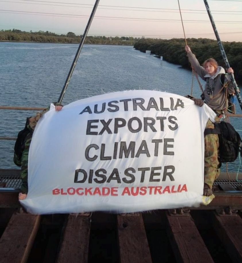 I alt 19 tog som fraktet kull til Australias viktigste eksportknutepunkt for dette drivstoffet, ble stanset etter at klimademonstranter hengte seg opp i to stolper over jernbanesporene.