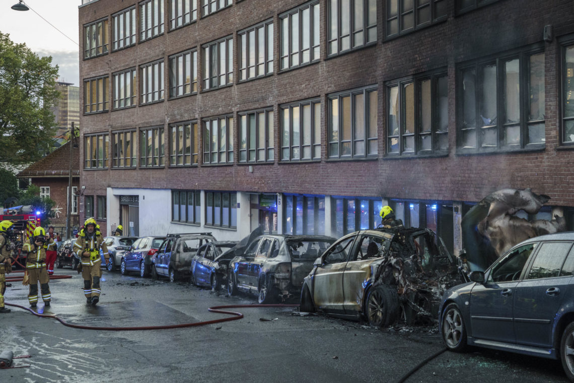 To biler, en Tesla og en Porsche, ble fysisk påtent, og den kraftige brannen spredte seg til tre andre. Det oppgis ikke etnisitet på de tiltalte som må møte i Oslo tingrett i desember.