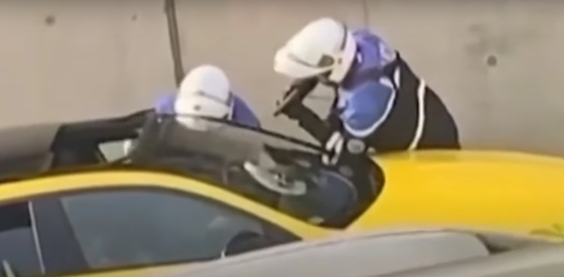 Politibetjenten ser da ut til å skyte når bilen brått kjører av gårde. Den 38 år gamle politimannen som avfyrte det dødelige skuddet ble tatt i varetekt etterpå, og er under etterforskning for forsettlig drap. (Al-Jazeera)
