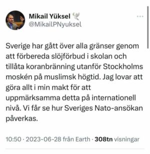 Brenningen av Koranen har vakt sterke reaksjoner. I Sverige lover Partiet Nyans’ partileder Mikail Yüksel i et innlegg på Twitter å «gjøre alt som står i hans makt» for å rette oppmerksomheten mot koranbrenningen «på internasjonalt nivå», og han truer også implisitt med at det kan påvirke Sveriges NATO-søknad.