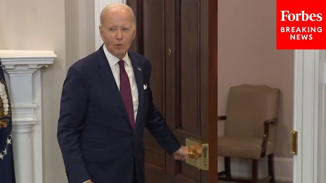 Man hører spørsmålet bli stilt mens Biden er på vei ut av rommet.