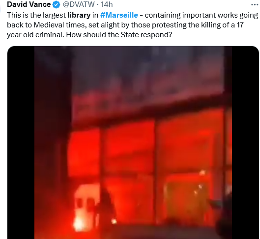 I Marseille, Frankrikes nest største by, har gjenger med væpnede opprørere plyndret butikker og satt fyr på biler og søppelkasser. De skal også ha angrepet et stort offentlig bibliotek.