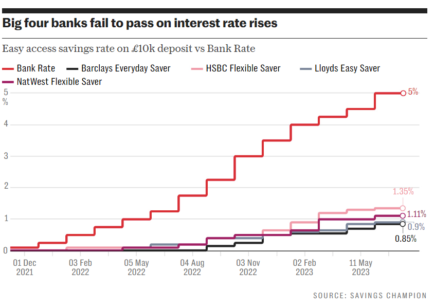 Når rentene går opp er bankene raske på labben til å øke lånerenta, mens sparekontoene avspises med smuler. Mange briter opplevde ynkelige 0,85 prosent på sine sparekontoer selv om styringsrenten hadde passert 4,5 prosent.