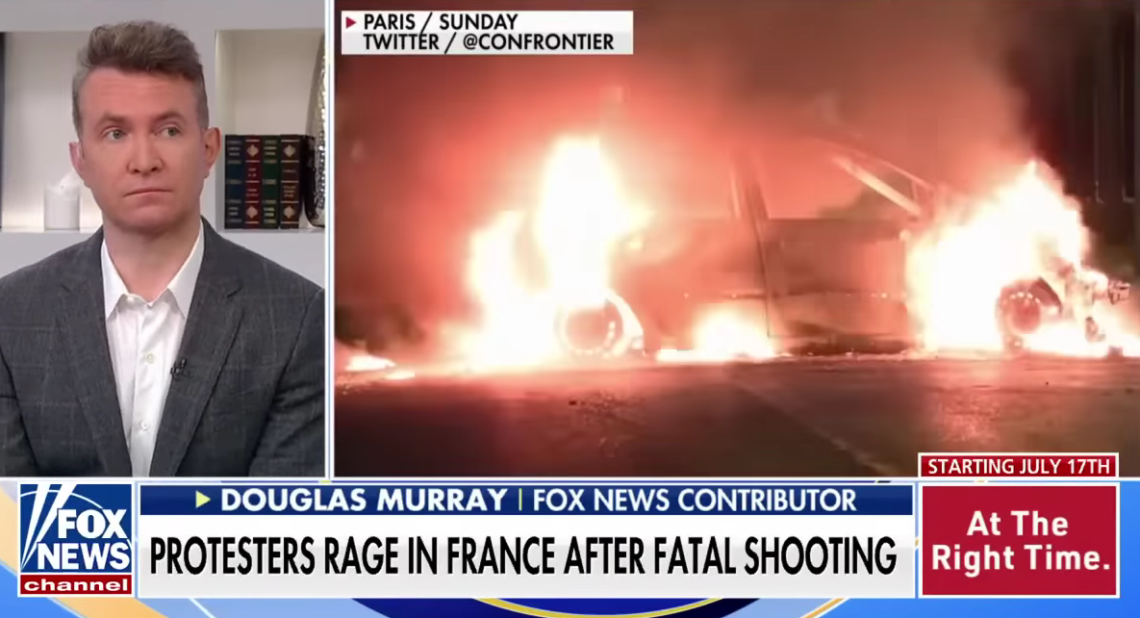 Douglas Murray, som er bidragsyter for Fox News sier på Fox & Friends at de voldelige protestene i Frankrike er et eksempel på hvorfor Amerika bør unngå åpne grenser og ulovlig immigrasjon. Han kalte protestene for a whole new order of disturbance.
