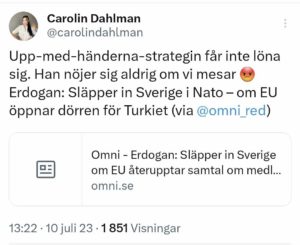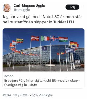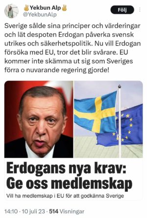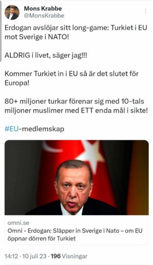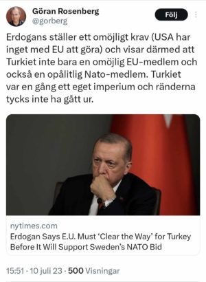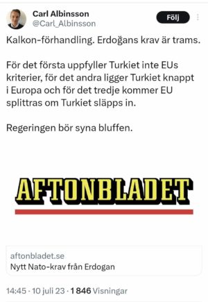 Svenskene er ikke overbevist om at det vil være riktig å bidra til at Tyrkia blir tatt opp i EU, selv om landets NATO-medlemskap står på spill. Mange tviler på at Erdogans siste krav – å godkjenne Sveriges søknad til NATO først når forhandlingene om tyrkisk medlemskap i EU er gjenopptatt – er det siste, og konsekvensene av tyrkisk medlemskap i EU vurderes som uoverskuelige og negative. Men det hindrer ikke Sveriges statsminister og NATOs generalsekretær i å uttale seg positivt om det tyrkiske kravet.