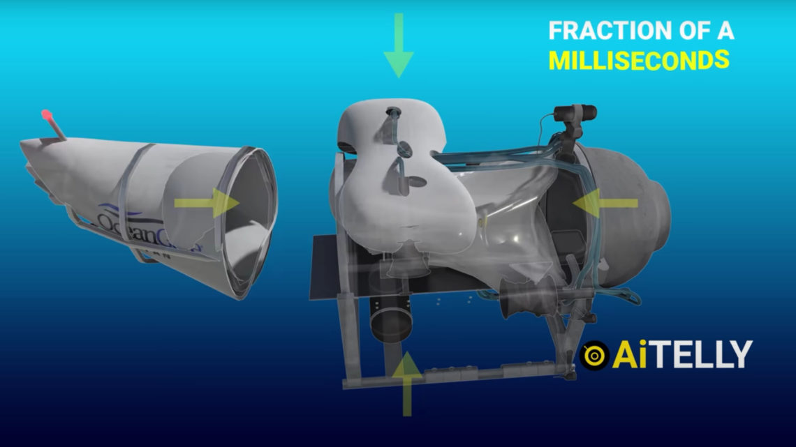 Animasjonen fremhever forskjellene mellom ubåtens eksperimentelle karbonfiberkonstruksjon og stål, titan og aluminium som tradisjonelt brukes i ubåtteknologi. Fiaskoen skyldtes at det eksperimentelle skroget ikke tålte det enorme hydrostatiske trykket i dypet der vraket av Titanic ligger.