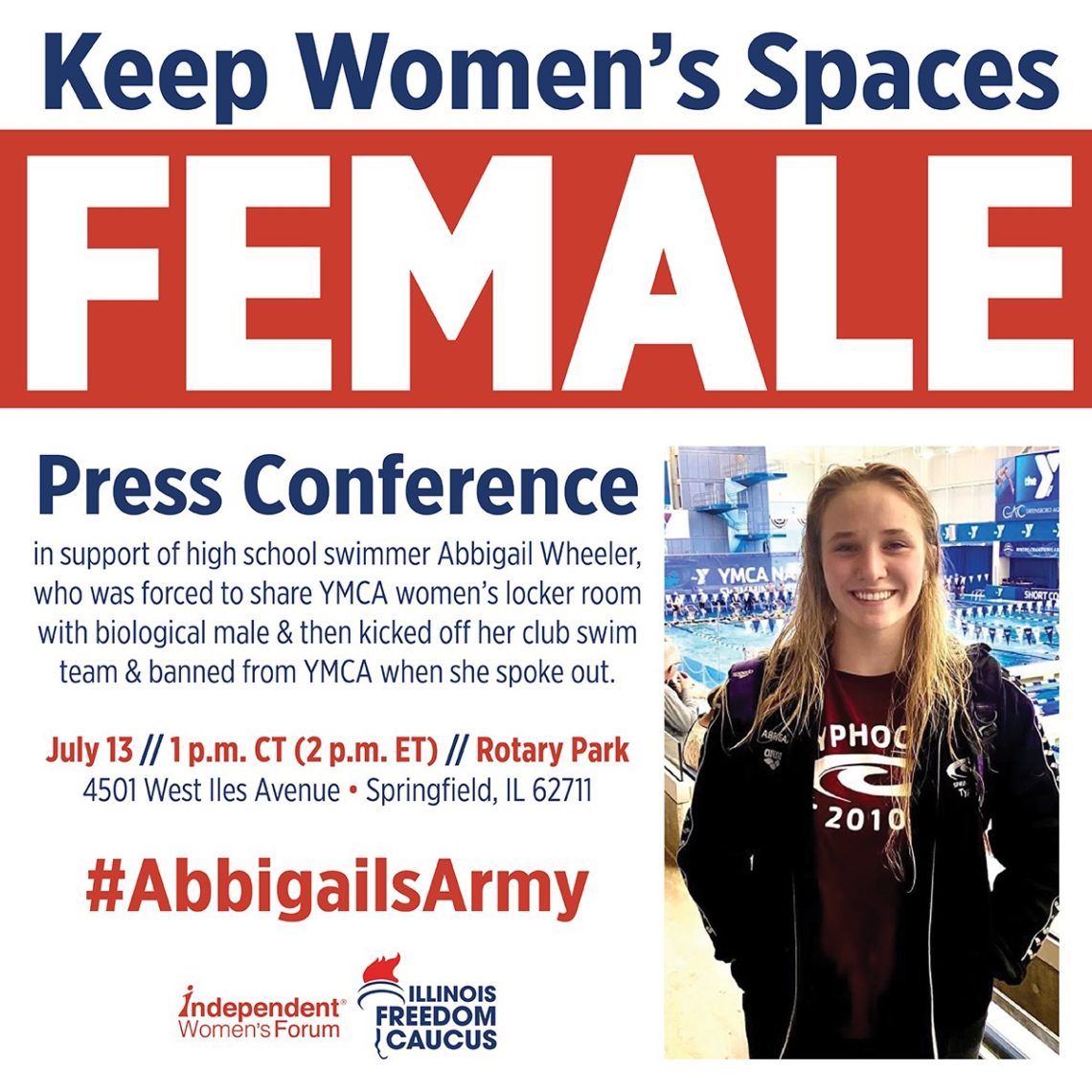 Abigail Wheeler, som er 16 år gammel, er blitt utestengt fra YMCA i Springfield, Illinois, etter at hun fredelig protesterte mot at hun møtte en mann i kvinnegarderoben. Hjertet hennes er knust. Hun har svømt der i elleve år, og ønsket ikke å måtte forlate YMCA.