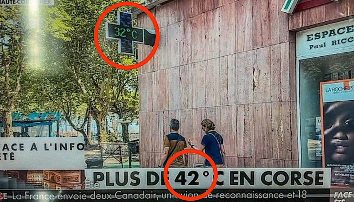 Medieoppslagene om høye temperaturer den senere tiden er en transnasjonal koordinert psyop-kampanje (psykologiske operasjoner), mener Robin Monotti, som har postet dette megetsigende tv-bildet til Twitter.
