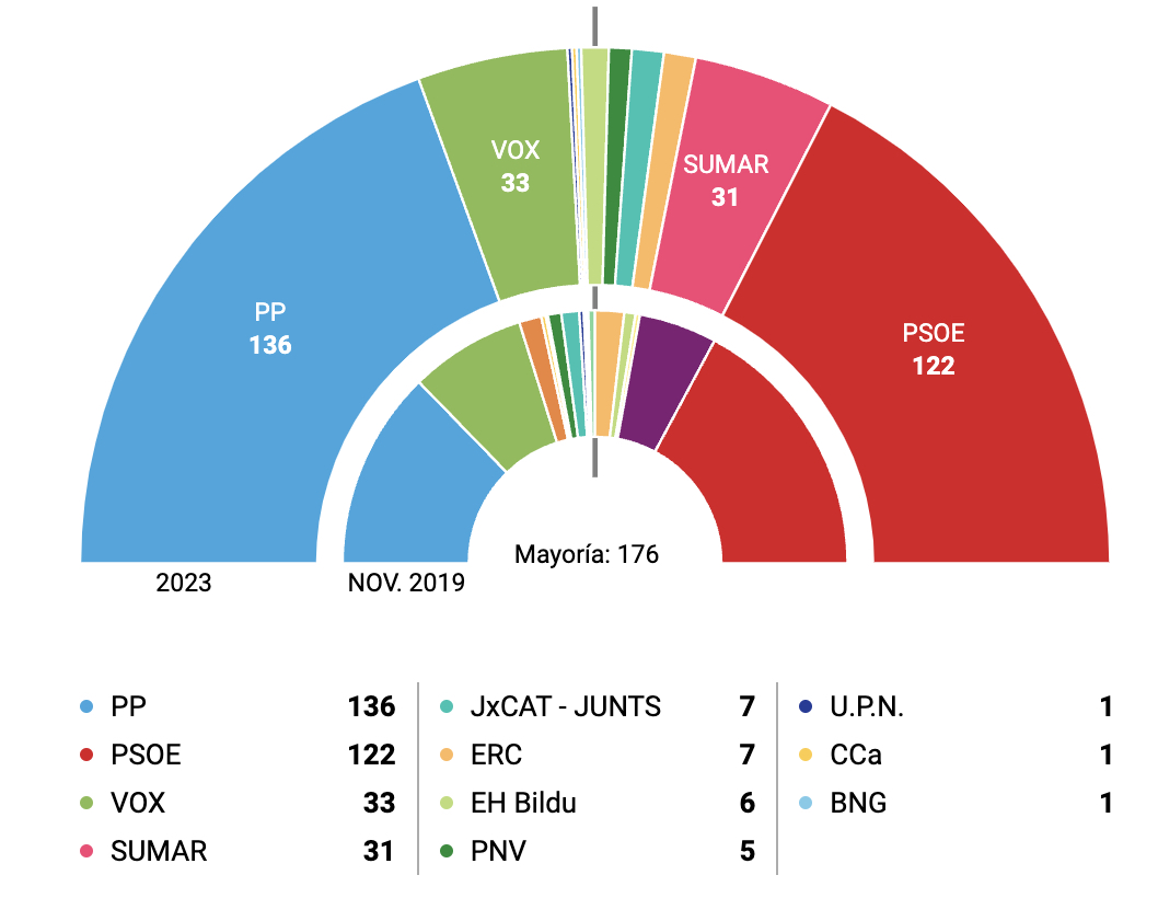 Mens Partido Popular (PP) og Vox ligger an til å få henholdsvis 136 og 33 av 350 representanter i deputertkammeret, er antallene 122 og 31 for PSOE og Sumar, melder El Mundo.