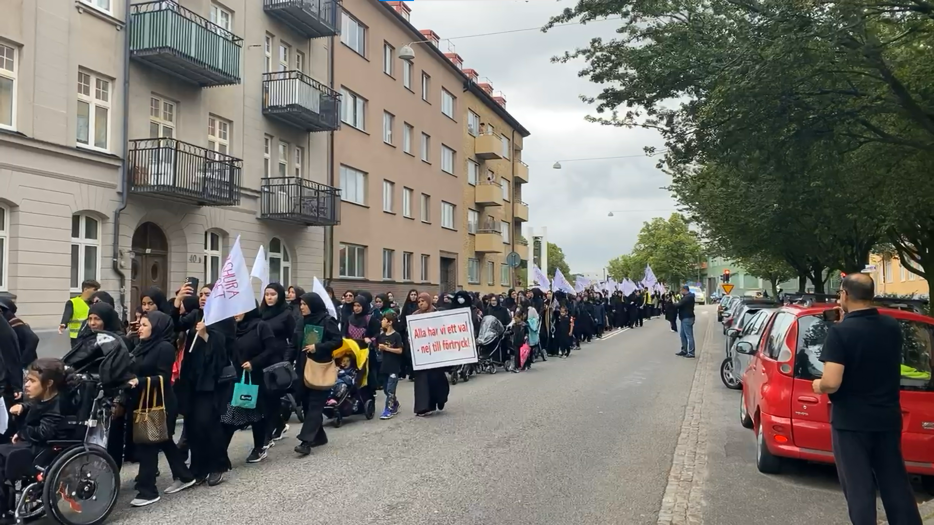 Svartkledde kvinner i tog i Malmös gater. Bilde fra Facebook.