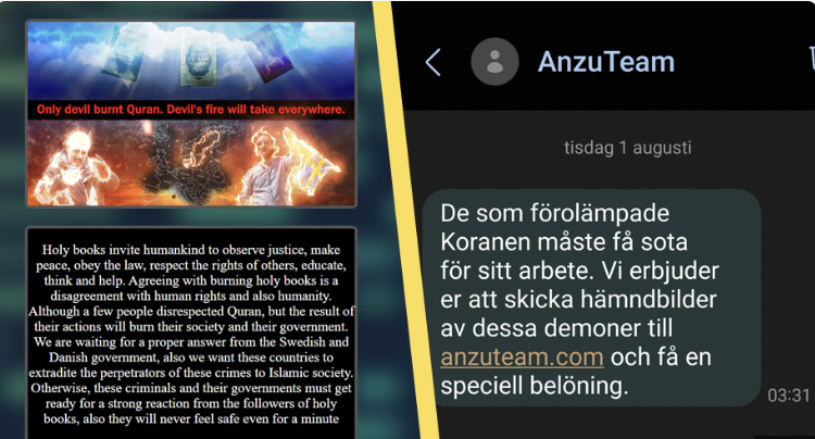 I en SMS sendt til flere svensker natt til tirsdag, etterlyses det hevn over de som brenner koraner. Det loves også belønning.