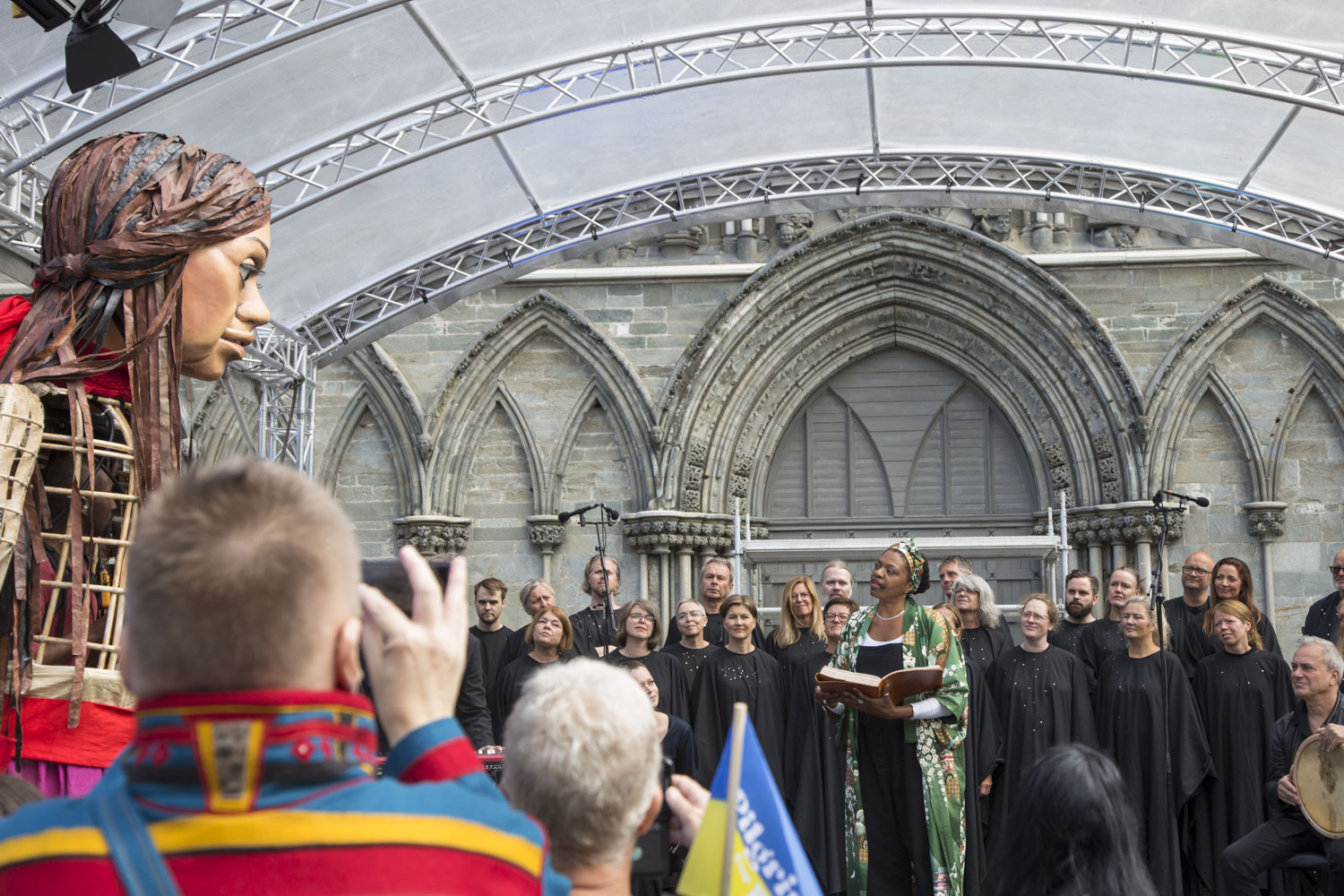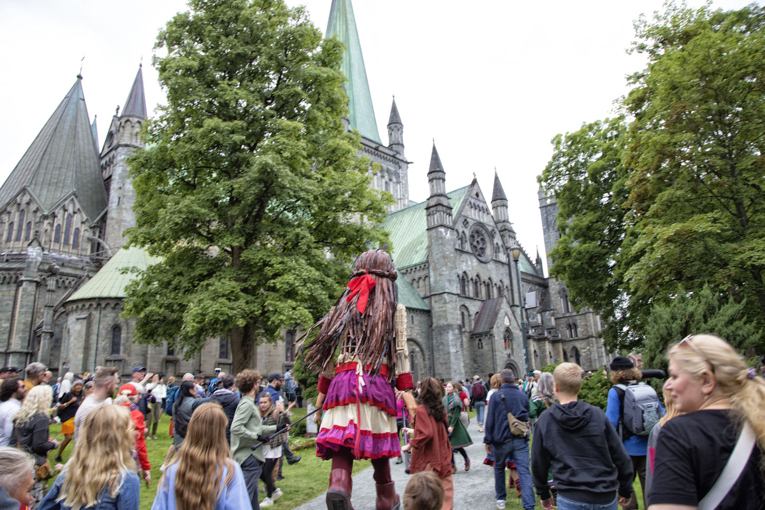 Lille Amal, den 3,5 m høye dukkeaktivisten som forestiller en liten jente fra Syria, gikk med selvsikre skritt bort til Olavsfesten ved Nidarosdomen. Vi går ut i fra at dukken skal være en liten muslim, ettersom det ellers ikke var noe fokus på verdens forfulgte kristne, eller kristendom i det hele tatt, når en ser bort ifra noen lite markedsførte gudstjenester. Foto: Bente Haarstad.