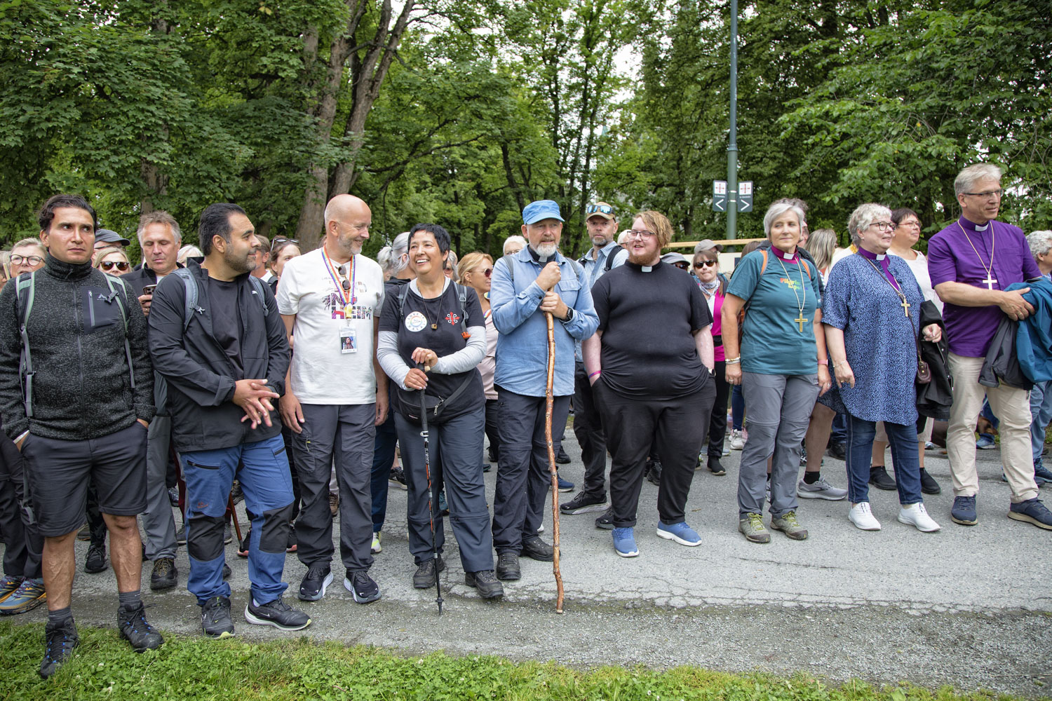 Den tyrkisk-tyske kvinnelige imamen Seyran Ates (i midten) fikk fint følge som pilegrim på siste etappe til Nidarosdomen. F.v. Ates’ venn Konstantin Sinan Carirci, stortingspresident Masud Gharahkhani, opprinnelig fra Iran, Steinar Larsen, ny direktør for Olavsfest, Ates, pilegrimsprest Einar Vegge (gift med ny biskop i Bjørgvin, Pride-aktivisten Ragnhild Jepsen), ukjent prest, biskop Herborg Finnset (også Pride-aktivist), ukjent biskop, og preses i Den norske kirke, Olav Fykse Tveit, og tidligere generalsekretær i Kirkenes Verdensråd. Muslimene altså til venstre, de kristne til høyre, og i midten i hvit skjorte, Steinar Larsen, sjef for Olavsfestivalen og selverklært ateist. Foto: Bente Haarstad.