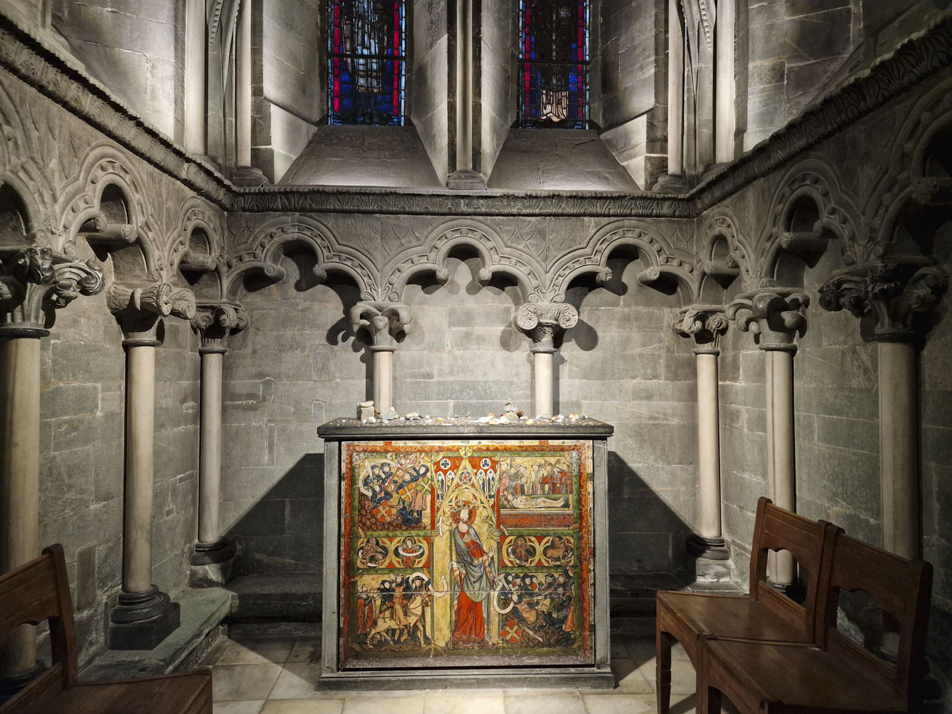 Olavsfrontalet er et Olavsbilde som befinner seg i Olavskapellet i oktogonen i Nidarosdomen. Dvs. det gjorde det. Nå står det en kopi der, mens originalen er i museet i Erkebispegården. Maleriet kalles frontale fordi det er plassert foran alteret. Det ble malt omkring 1330. Foto: Bente Haarstad.