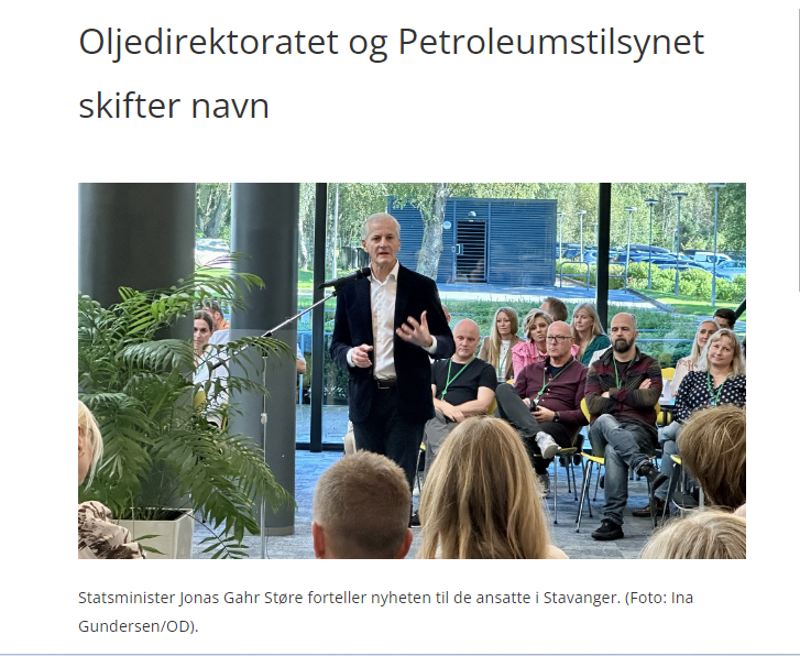«Gjennom disse navneendringene anerkjenner vi det viktige arbeidet direktoratet og tilsynet gjør i utviklingen av transport og lagring av CO2, havvind og havbunnsmineraler, sa statsministeren på et allmøte med de ansatte i OD og Ptil.