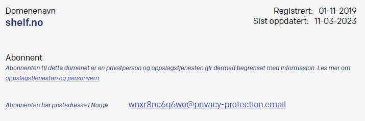 Nei, det nye navnet må bli shelf.no, som er ledig, og parkert av en smarting med postadresse i Norge, forteller registeret for norske domenenavn (Norid) oss: