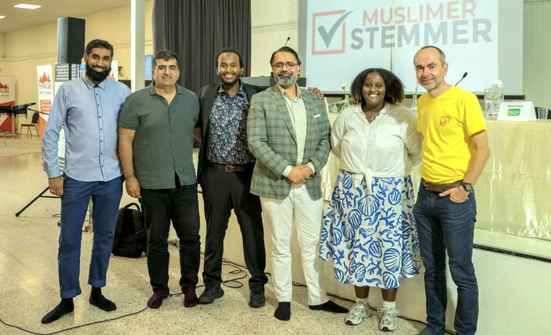 Øyvind Håbrekke (t.h.), politiker for KrF i Oslo, deltok på valgseminar arrangert av Islam Net. F.v. Fahad Qureshi, leder av Islam Net, Shoaib Sultan, tidligere talsmann for Islamsk Råd Norge og Antirasistik Senter, nå politiker for MDG, representant fra Islam Net, Zaeem Shaukat, pakistaner fra Partiet Sentrum, som oppfordrer til å stemme frem islam i Norge, Sareedo Ali fra Rødt, og Håbrekke, som håper å få muslimer til å stemme på det tidligere kristne folkepartiet. Skjermdump fra Facebook.