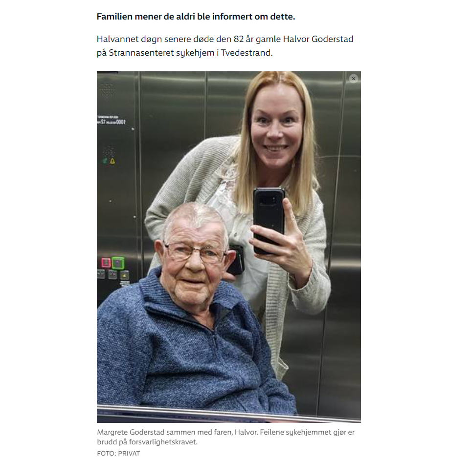 NRK vet å velge sine ord, for vi kan jo ikke innrømme at kanskje helsevesenet i Norge ikke er så mye bedre enn i USA, selv om de skal ha ros for å rapportere om lovbrudd på sykehjem. Men på den annen side burde slike historier være dagligdagse i statskanalen og andre medier, for det finnes hundrevis av skrekkeksempler som dette.