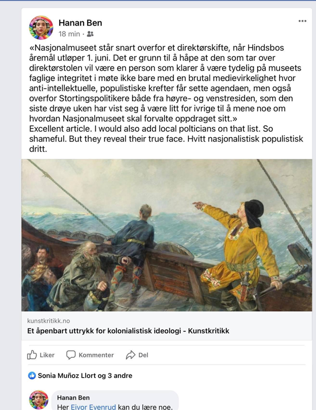 I dag oppdaget jeg at Hanan Benammar er medlem av gruppen. Hun hadde likt innlegget som fortalte oss at vi ikke var vikinger.