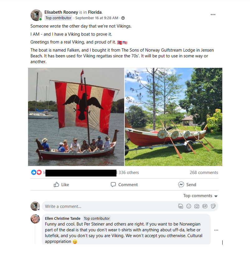 Det var beskyldninger om at måten norskamerikanere feiret sine aner på, var kulturell appropriering, de hadde ingen rett til å kalle seg vikinger eller gå med T-skjorter med fjollete motiv om Norge, si «huff da», fremme lutefisk, lefse som typisk norsk, osv. Jeg har lagt ved noen av samtalene nederst på siden.