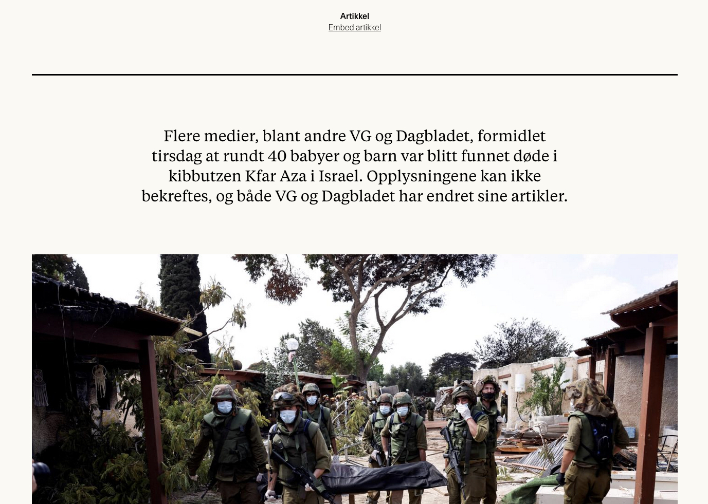 Hverken NRK eller noen annen europeisk nyhetsformidler setter spørsmålstegn ved om dette stemmer. Og «faktisk.no» kommer ikke på banen. IDF melder at de undersøker saken.