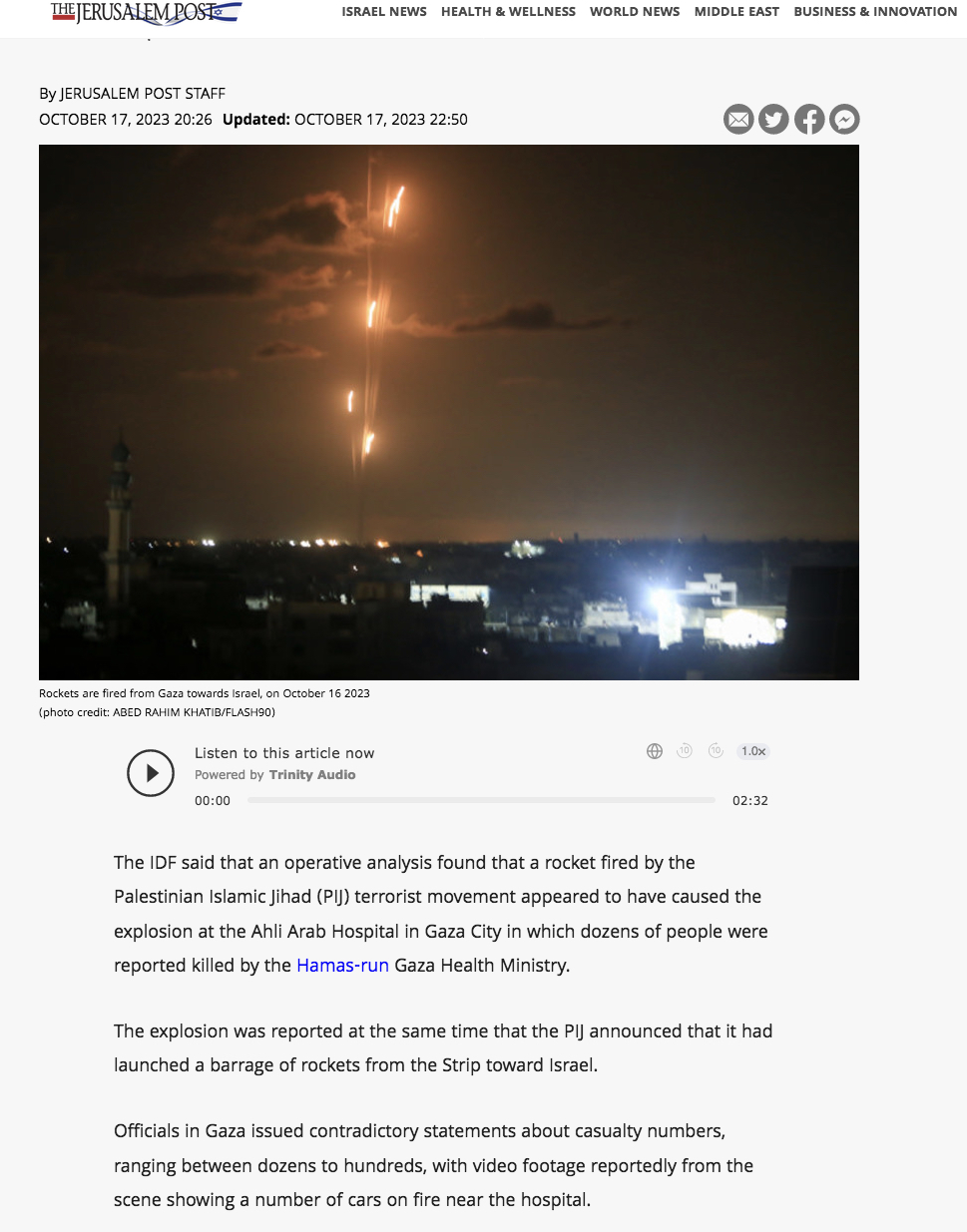 Det kommer tirsdag kveld rapporter fra Israel som sier at angrepet på sykehuset var en rakett fra Islamic Jihad på vei til Israel.