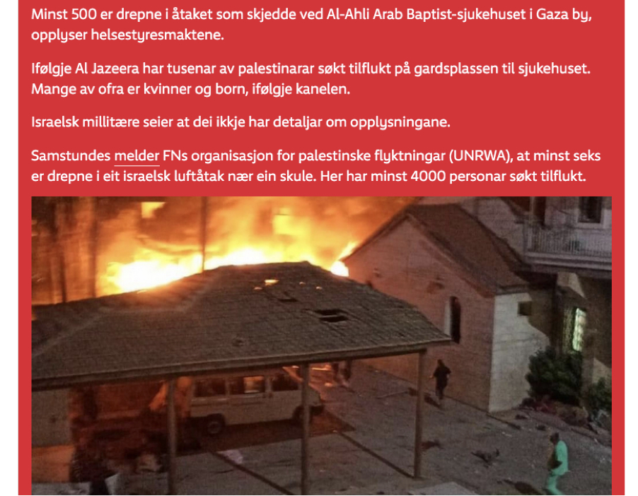 Tirsdag publiserer vestlig presse inkludert NRK (NTB) en melding i fra Hamas om at Israel (IDF) har bombet et sykehus i Gaza, med over 500 døde. Og den muslimske verden begynner umiddelbart å koke!