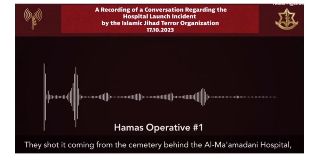 Den israelske hæren overvåker kontinuerlig Hamas. I dag har de publisert et lydopptak mellom to Hamas-terrorister om raketten som Palestinsk islamsk jihad sendte opp fra Gaza for å angripe Israel, men som slo ned feil og isteden traff sykehuset i Gaza.